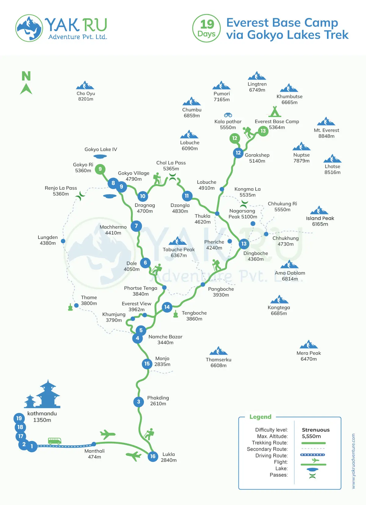 Like the other treks of the Everest region, our Everest Base Camp and Gokyo Lakes Trek Itinerary starts and ends at the same place, Lukla, which is a short, electrifying flight from Kathmandu. All of our itineraries are customizable as per your preferences, time frame, physical fitness, etc. Just leave us a message, and we will help you create the perfect one.