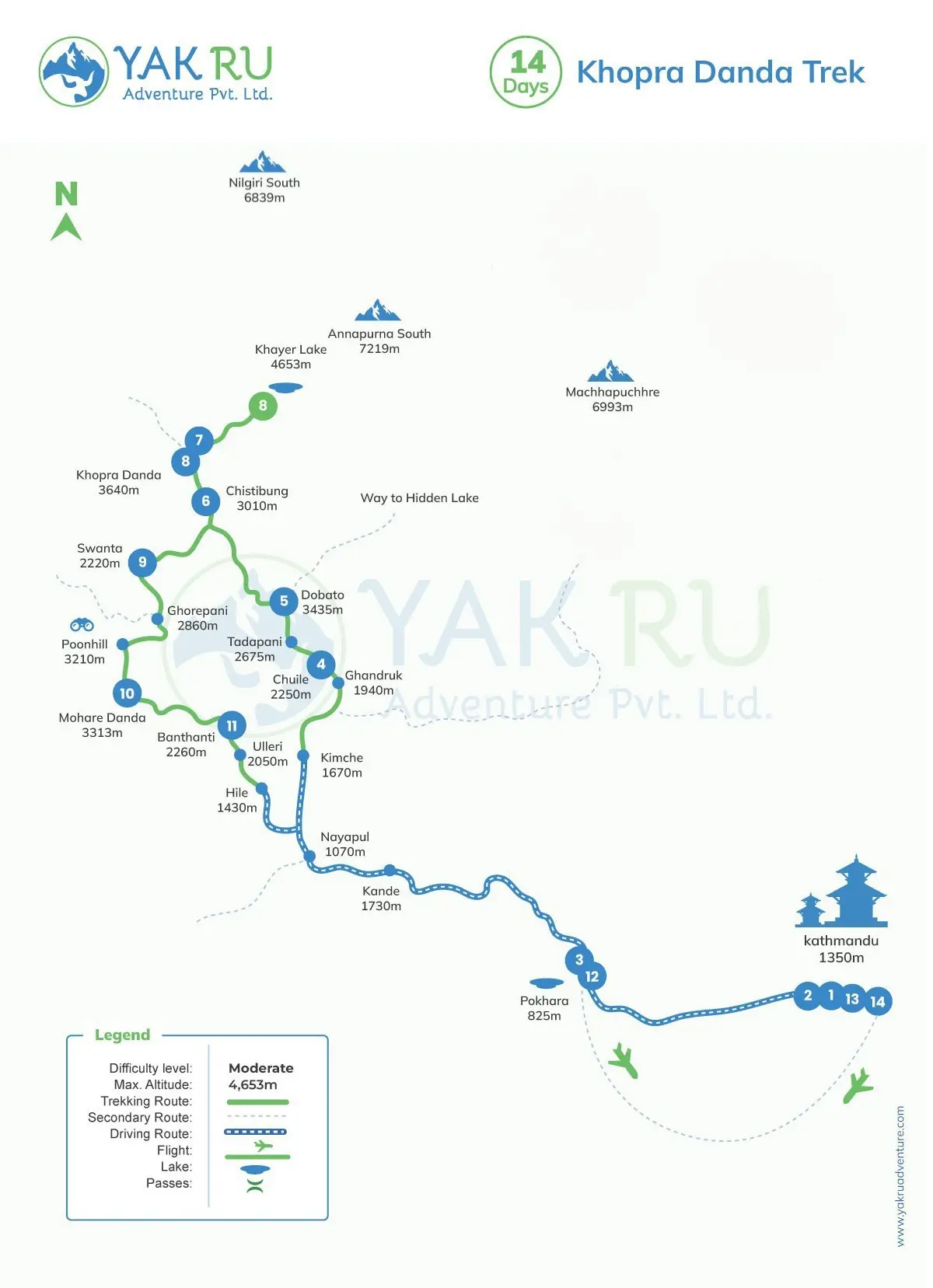 Our 14-day Khopra Danda Trek Itinerary starts from Kimche, and then to Tadapani via Ghandruk, a route of the famous Ghorepani Poon Hill Trek. From there, we take the trail north of Tadapani towards Dobato. The trek ends at Hille. If you want to customize the itinerary according to your desire, physical fitness level, or time frame, please do let us know. Our experts will help you create the perfect itinerary that ensures a top-notch experience with safety.