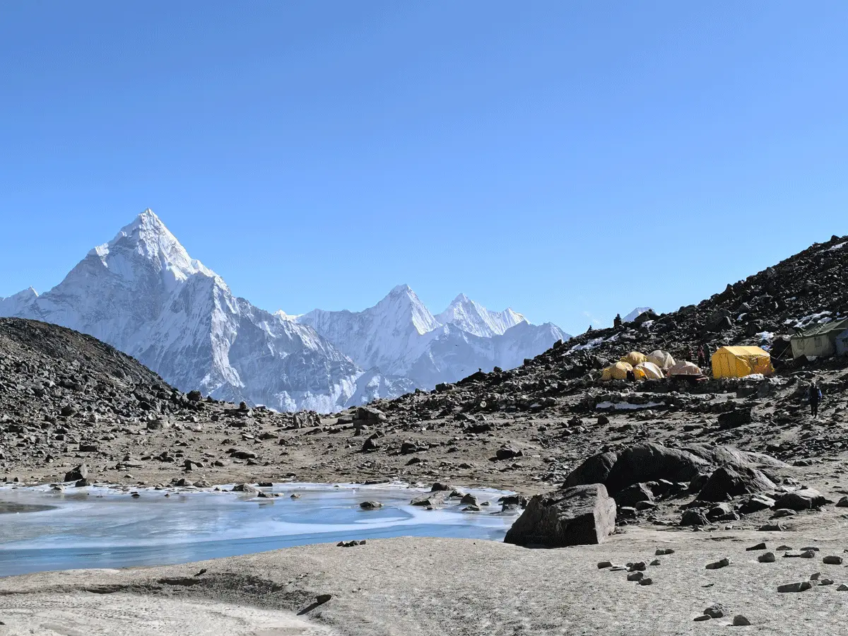 Then we will retrace our way back to Lobuche Base Camp and head towards the high camp from where the real adventure begins. There, we will have a brief session on basic climbing techniques with our professional climbing guide. We will start the climb early in the morning. The initial part of the climb, till the Crampon Point, will be through the rocky sections. From there, we will ascend the icy slopes mostly at around 50 degrees through fixed lines.