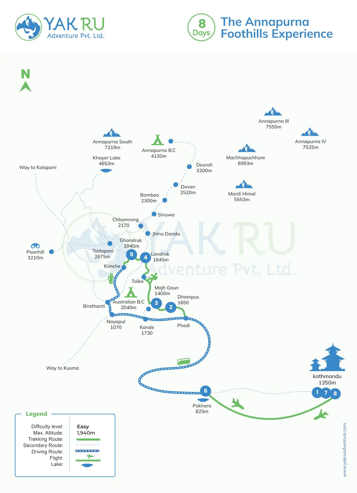 Our Annapurna Foothills Experience Itinerary is 8 days long. The 5-day easy trek starts from Dhampus Phedi and ends at Ghandruk. The best thing about our trip itineraries is that they can be modified to suit your preferences. Let us know, and we will help you create the best one.